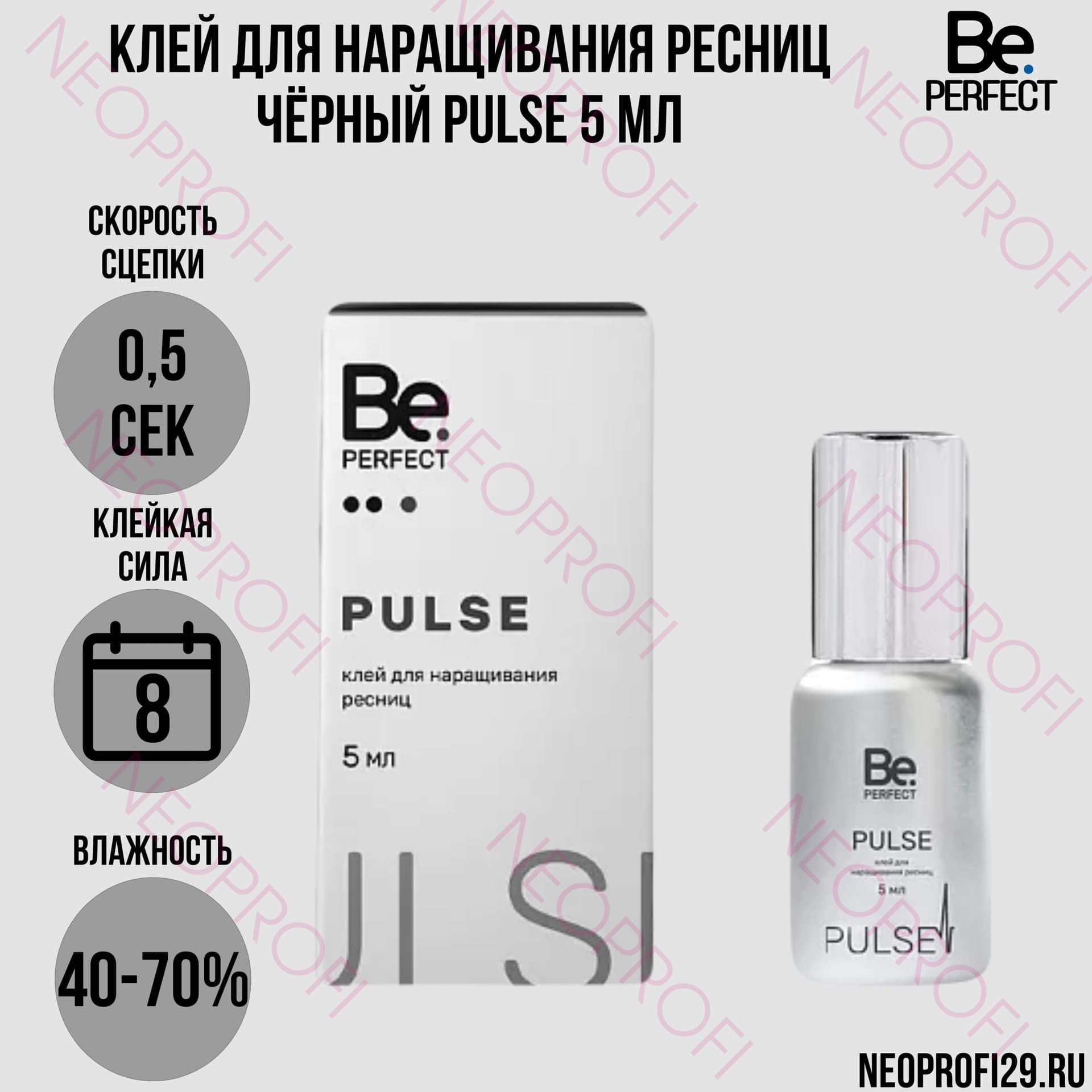 Клей Be Perfect для наращивания ресниц Pulse применяется для приклеивания искусственной ресницы к натуральной профессиональными лэшмейкерами. Жидкая консистенция позволяет сделать сцепку моментальной, а количество испарений сведено к минимуму, что снижает риск проявления аллергической реакции. Мгновенная фиксация позволяет эффективно работать в технике объемного наращивания.