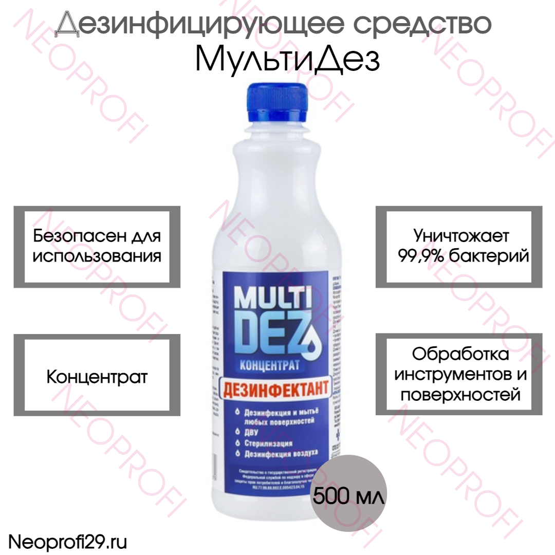 Стерильность – признак профессионализма! Используйте эффективные средства для очистки, дезинфекции и стерилизации инструментов, в том числе маникюрных. Профессиональное средство для ДЕЗИНФЕКЦИИ и СТЕРИЛИЗАЦИИ инструментов, поверхностей, помещений MultiDez Концентрат Дезинфектант. Имеет НЕЙТРАЛЬНЫЙ pH дезинфектор не вызывает коррозии металлов. Дез средство эффективно уничтожает вирусы, бактерии и грибы. Дезинфицирующее средство для очистки воздуха и помещений, рабочих поверхностей и маникюрных инструментов в Бьюти индустрии, ногтевого сервиса, медицинского назначения. Дезсредство Мультидез отличается максимальной ЭКОНОМИЧНОСТЬЮ, обладает следующими преимуществами: раствор НЕ ПОРТИТ очищаемые поверхности; НЕ ОБЕСЦВЕЧИВАЕТ ткани; НЕ ВЫЗЫВАЕТ КОРРОЗИИ металлов; БЕЗ ЗАПАХА - в отличие от хлорид содержащих препаратов. ЭФФЕКТИВНОСТЬ рабочего раствора ПОДТВЕРЖДЕНА СПбГМА им. Мечникова. Жидкость эффективно УНИЧТОЖАЕТ БАКТЕРИИ, ВИРУСЫ, любые виды ГРИБКА, подходит для использования от лишая и для обработки и мытья бань, мытья полов. ГИПОАЛЛЕРГЕНЕН, БЕЗОПАСЕН для здоровья детей, домашних животных. Лучшее средство для обработки инструмента для МАНИКЮРА, подходит для всех ЭТАПОВ. 1 шаг - Дезинфекция в лотке, контейнере или УЗ мойке 2 шаг - Предстерилизационная очистка (ПСО) 3 шаг - Стерилизация