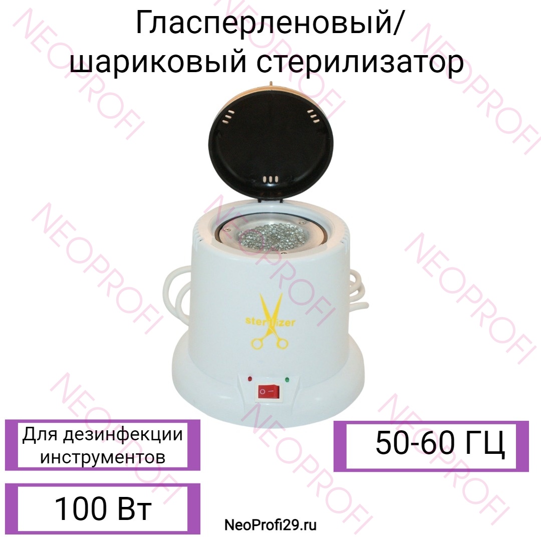 Гласперленовый (шариковый) стерилизатор предназначен для дезинфекционной обработки косметологических маникюрных и парикмахерских инструментов, путем погружения их в колбу со стеклянными шариками, разогретыми до температуры от 165 до 200°С. Время стерилизации составляет 5-10 секунд. Такой вариант дезинфекции подходит только для обработки металлического инструмента. Пластиковый инструментарий и отдельные его части будут деформироваться от контакта с разогретыми стеклянными шариками. Кроме того, шарики необходимо периодически менять в зависимости от интенсивности использования. При постоянной эксплуатации шарики меняют раз в 10-12 месяцев.