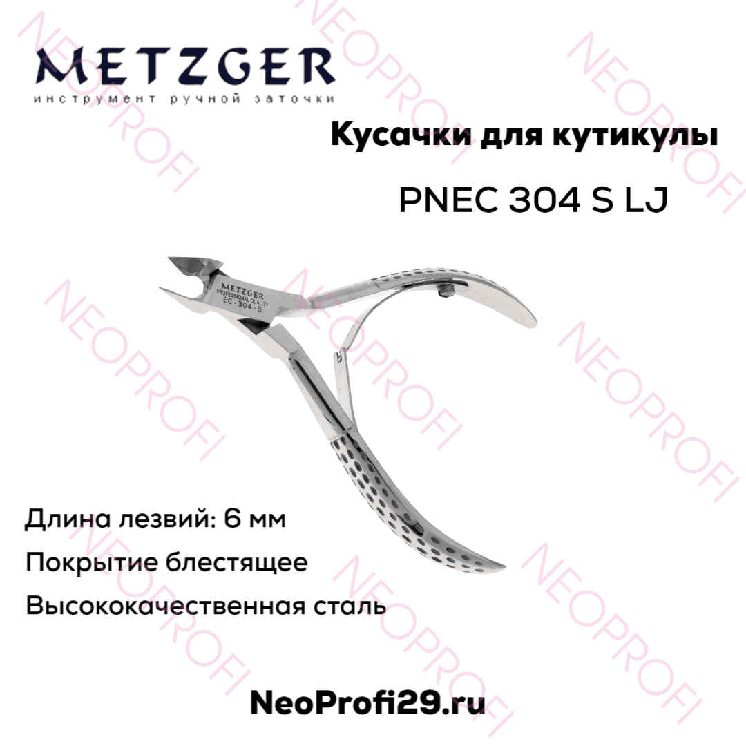 Кусачки кутикульные PNEC-304-S(6mm)-LJ (блестящие) Metzger для тщательного удаления кутикулы и заусениц даже в углах и вдоль ногтевого ложа. Кусачки выполненны полностью из углеродистой кованной медицинской нержавеющей стали. Острая заточка и нано-полировка лезвий позволяют обрабатывать зону вокруг ногтя с особой тщательностью. Длина лезвий - 6мм, длина кусачек - 10 см.