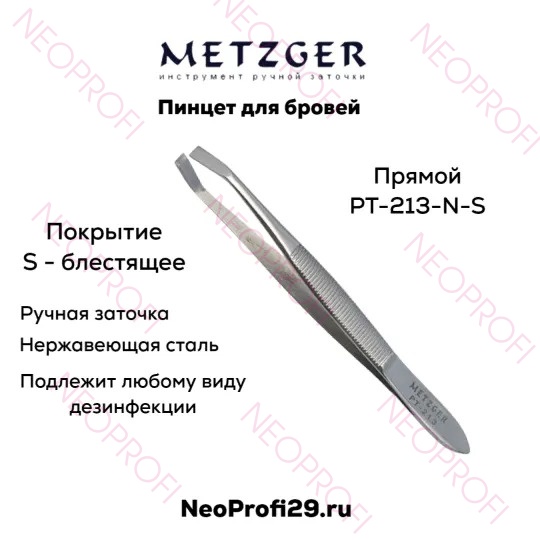 Пинцет для бровей прямой PT 213 NS блестящий Metzger