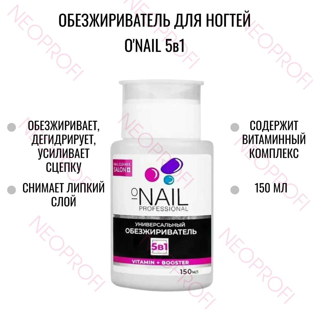 Обезжириватель для ногтей и снятия липкого слоя O'NAIL 5в1 Cleaner помпа 150мл