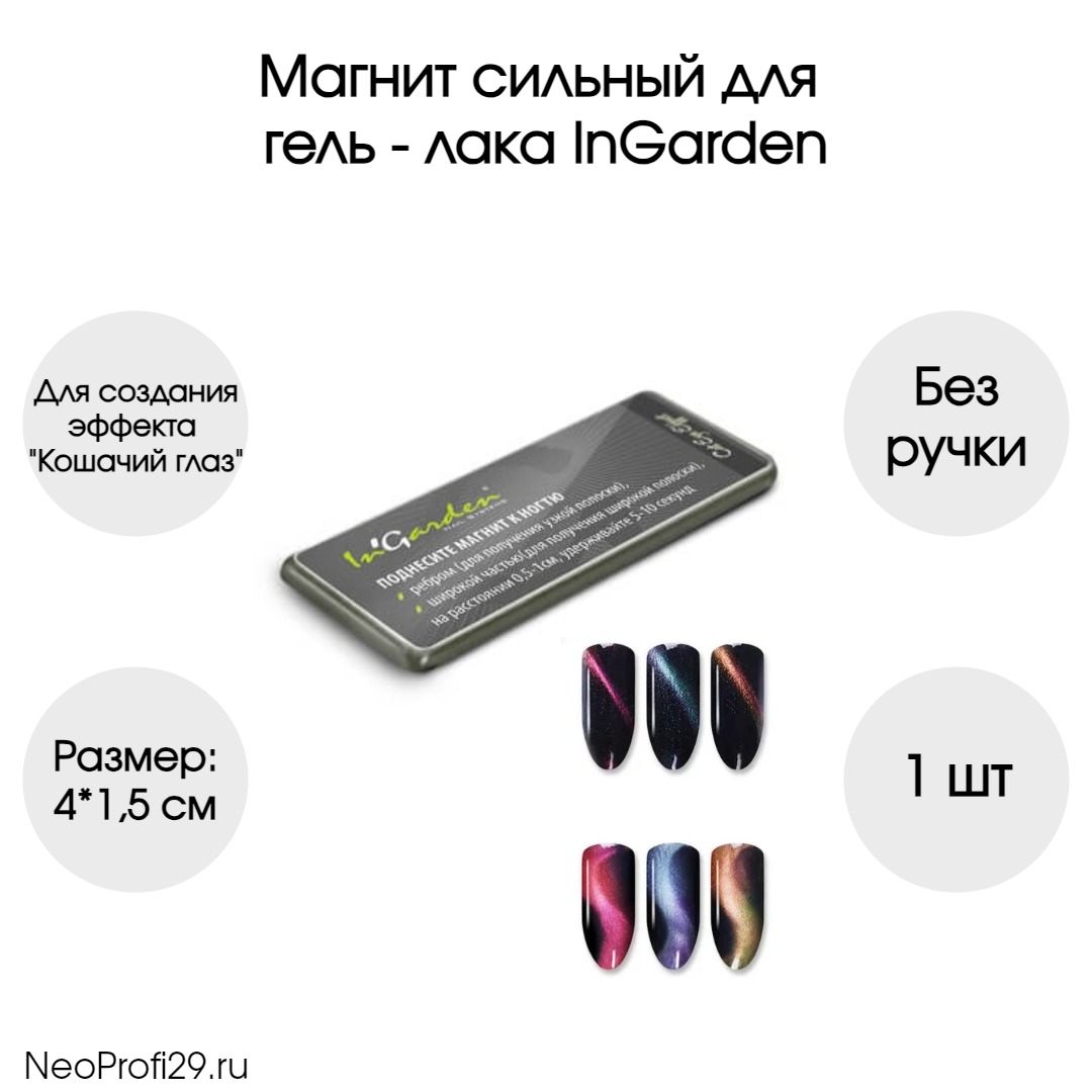 Поднесите магнит ребром к ногтю с неполимеризованным покрытием цветного гель-лака. Расстояние от ногтя должно быть 0,5 мм-1см. Удерживайте магнит 5-10 секунд. На поверхности гель-лака появится красивая полоска, как на камне «Кошачий глаз». Размер: 40x15 мм.