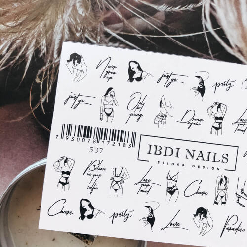 Дизайны Ibdi Nails выполнены на ультра тонкой полимерной пленке на бумажной основе, отличаются насыщенностью цвета и самыми яркими дизайнами. Пленка снимается с подложки путем размачивания, пленка пластична, повторяет форму ногтя, легко можно подкорректировать изображение на ногте. Слайдер-дизайн рекомендуется клеить на белый или светлый фон. При правильном применении и соблюдении инструкции, носка до коррекции.