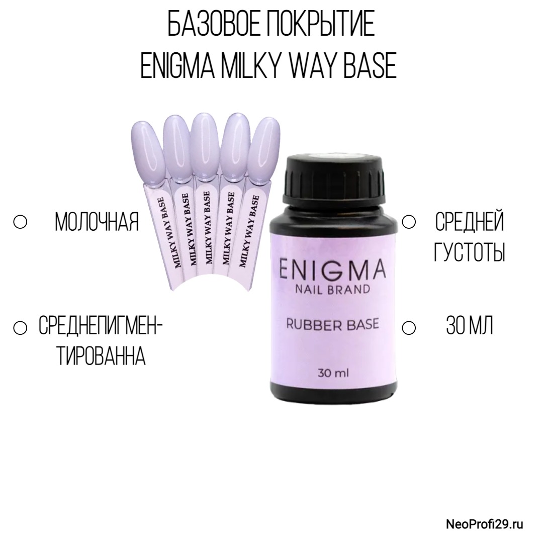 Легкая, невесомая, словно облачко новая молочная база Enigma Milky Way base. База среднепигментированна, по праву может называться Молочной базой! Отлично выравнивает ногтевую пластину, приятная консистенция, не желтит. Вы полюбите её с первого нанесения! При работе с тонкими, гнущимися ногтями, рекомендуется нанести тонкую подложку из rubber базы.