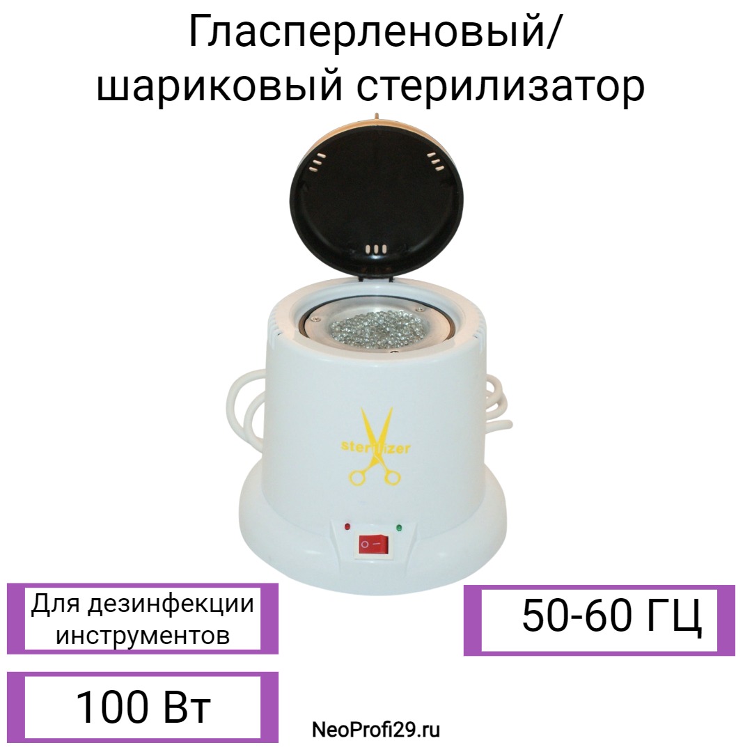 Гласперленовый (шариковый) стерилизатор предназначен для дезинфекционной обработки косметологических маникюрных и  парикмахерских инструментов, путем погружения их в колбу со стеклянными шариками, разогретыми до температуры от 165 до 200°С. Время стерилизации составляет 5-10 секунд. Такой вариант дезинфекции подходит только для обработки металлического инструмента. Пластиковый инструментарий и отдельные его части будут деформироваться от контакта с разогретыми стеклянными шариками. Кроме того, шарики необходимо периодически менять в зависимости от интенсивности использования. При постоянной эксплуатации шарики меняют раз в 10-12 месяцев.