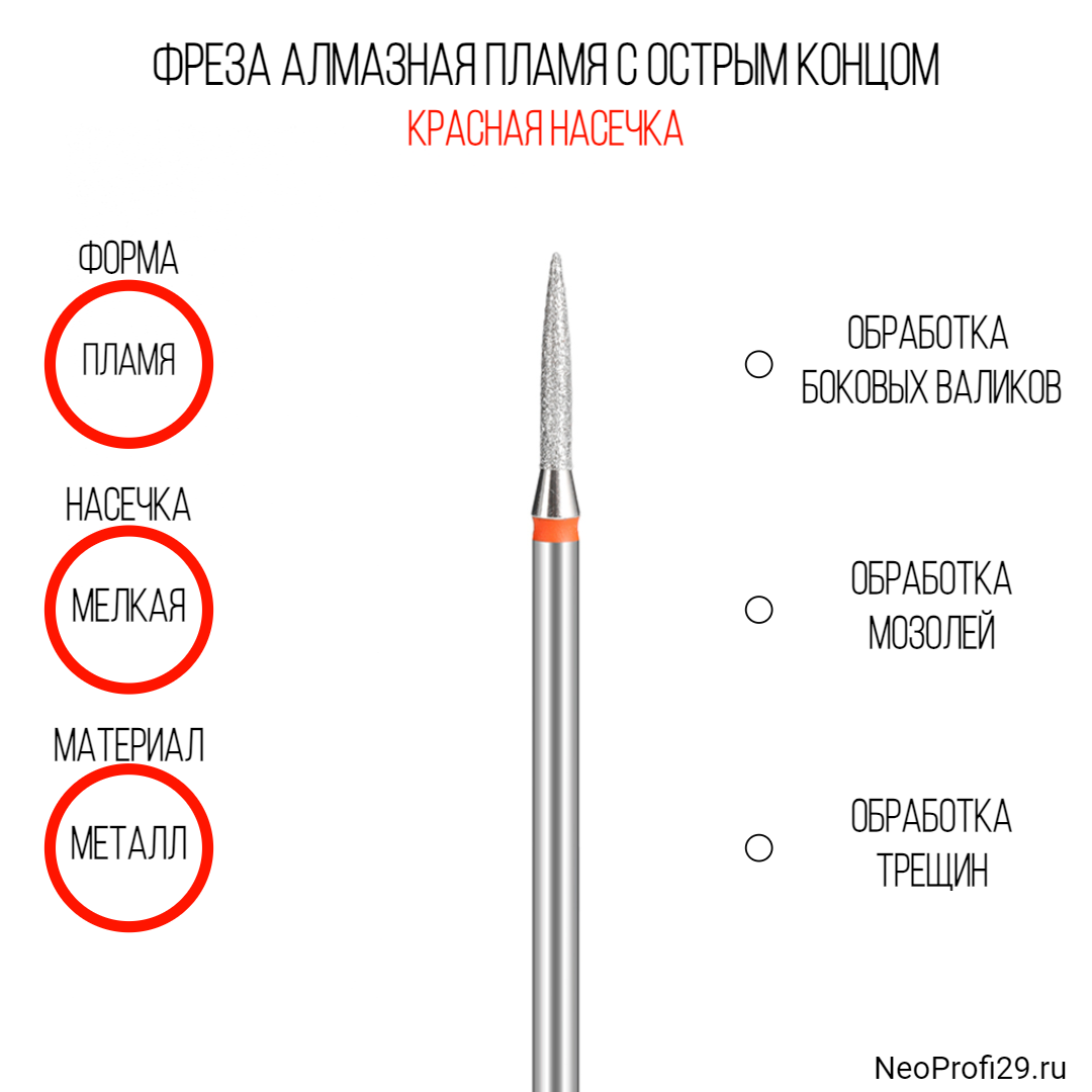 Фреза алмазная Пламя с острым концом D 1,6 мм красный Китай
