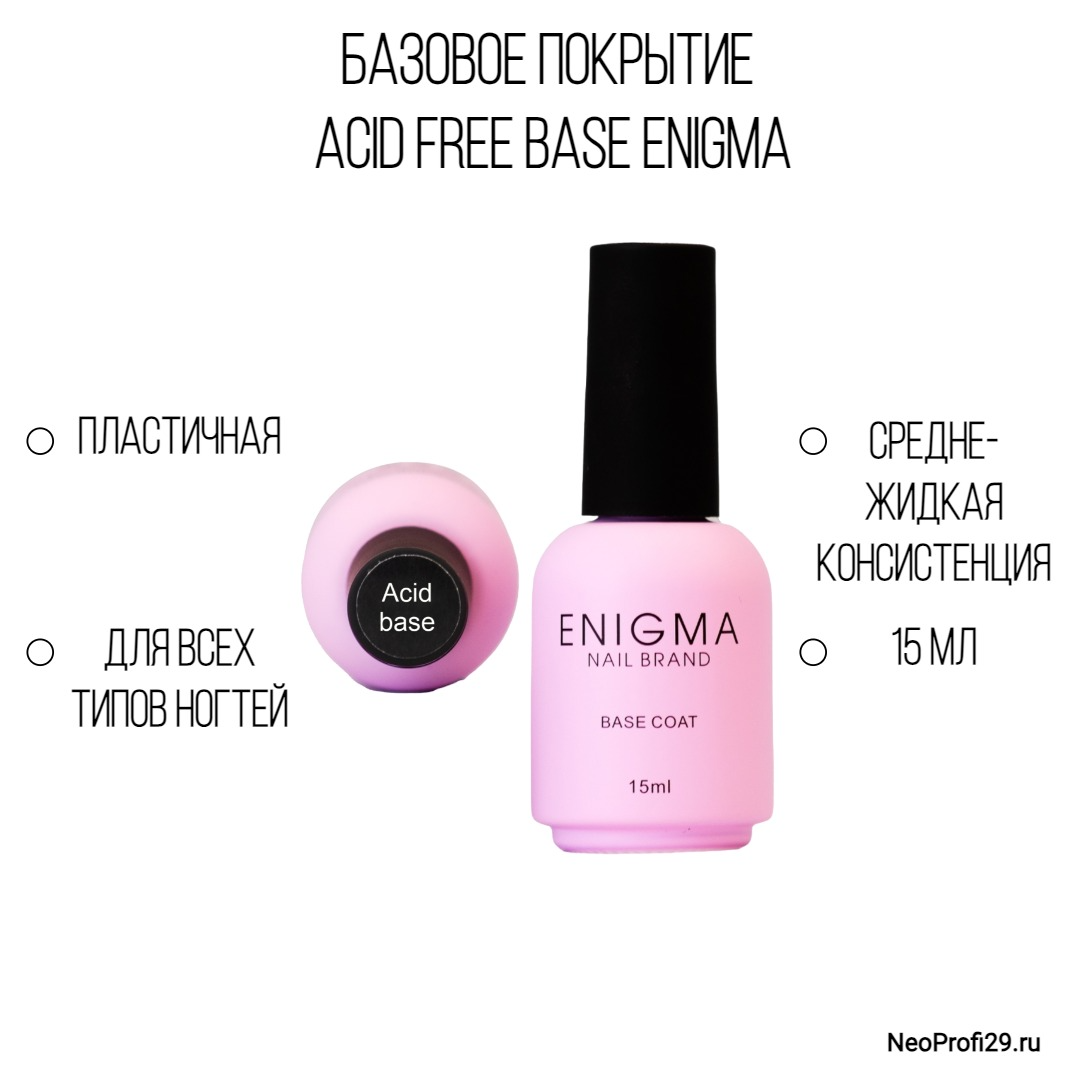 Пластичная бескислотная Enigma Acid Free база с очень приятной комфортной средне-жидкой консистенцией идеально подходит как в качестве подложки так и как самостоятельная база, ну и конечно же для педикюра. Подходит абсолютно для всех типов ногтей.