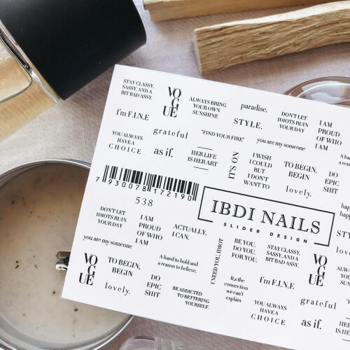 Дизайны Ibdi Nails выполнены на ультра тонкой полимерной пленке на бумажной основе, отличаются насыщенностью цвета и самыми яркими дизайнами. Пленка снимается с подложки путем размачивания, пленка пластична, повторяет форму ногтя, легко можно подкорректировать изображение на ногте. Слайдер-дизайн рекомендуется клеить на белый или светлый фон. При правильном применении и соблюдении инструкции, носка до коррекции.