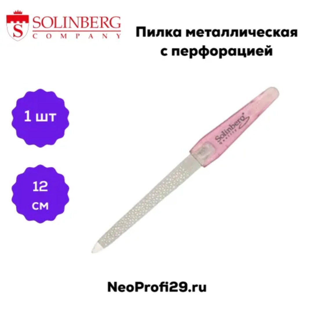Пилочка металлическая Solinberg с перфорацией 12 см. Имеет пластиковую ручку и рабочую часть с алмазным покрытием и перфорацией.