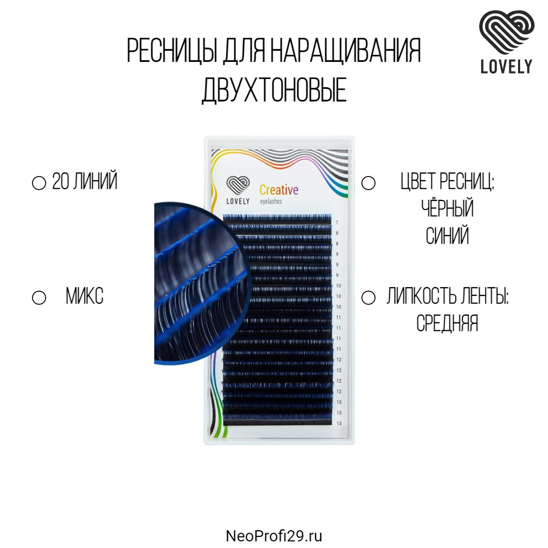 Двухтоновые синие ресницы созданы специально для любителей ярких образов и экспериментов. Особенностью двухтоновых ресниц является то, что основание имеет черный цвет, а кончики окрашены в синий. Такое сочетание цветов позволяет выгодно подчеркнуть глаза и добавить образу индивидуальности. Все двухтоновые ресницы Lovely изготавливаются из высококачественного волокна, легкие и эластичные, не деформируются в процессе работы и отлично держат форму во время носки.