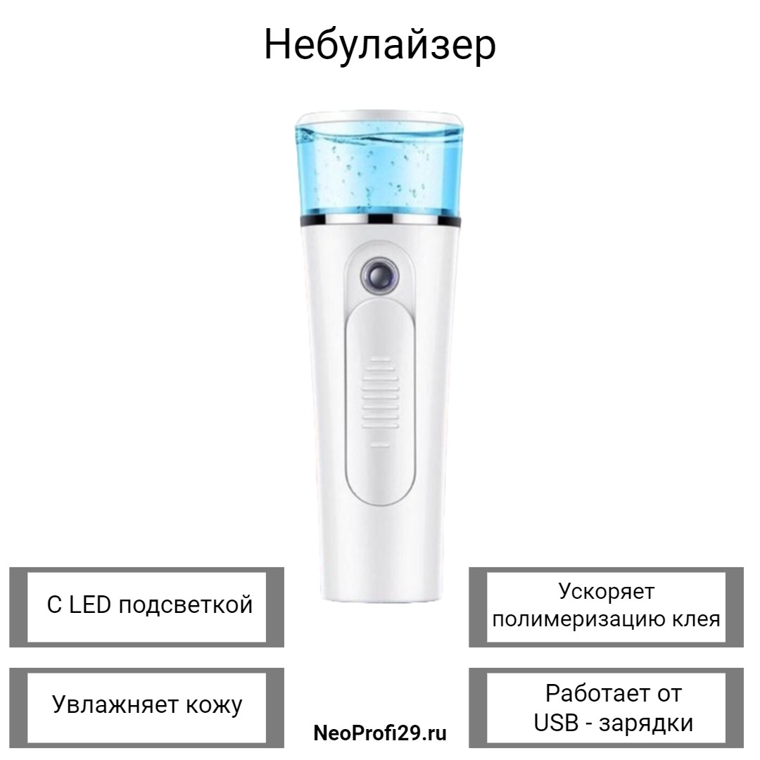Небулайзер разработан специально для мастеров по наращиванию. Он используется в конце процедуры наращивания и позволяет существенно ускорить процесс полимеризации и предотвратить покраснение и раздражение чувствительной кожи вокруг глаз клиента. Небулайзер удобен в работе, имеет компактный размер и легко помещается в руке.